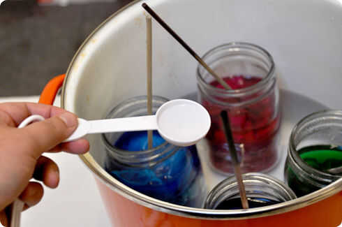 Dejar los frascos a fuego lento durante unos 15-20 minutos. No deje que el agua en ebullición olla burbujas forman debajo de los frascos y "bump", que puede resultar en frascos rotos y un lío para limpiar. Revuelva cada bufanda cada pocos minutos para ayudar a que el color penetre lo más posible.