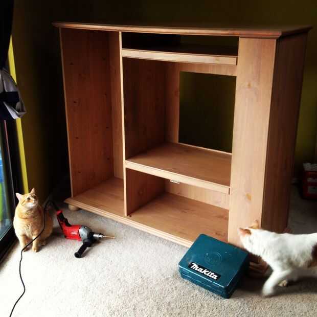 El reto:Tenía un centro de entretenimiento nuevo comprado en 2004. Me gustó el estilo, pero no acomodaría de una televisión de más de 35 pulgadas de ancho. Esto no funcionó en el nuevo mundo de televisores de pantalla plana grande. En 2008, decidió o
