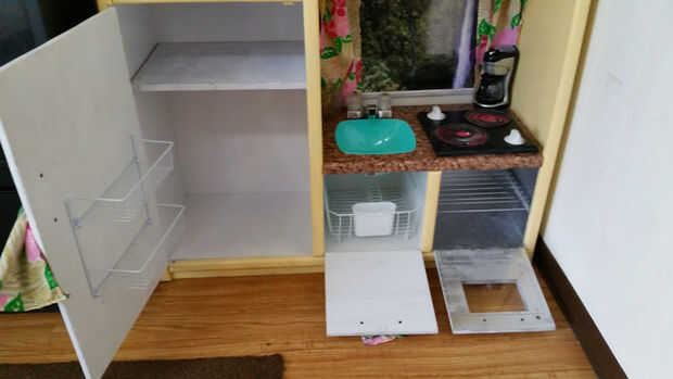 Había pintado de la nevera y lavavajillas blanco y rociar el interior del horno con pintura en aerosol plata metálico. El fregadero es sólo una pequeña ensaladera y los recipientes fregadero eran de Walmart por unos cuantos dólares. La rejilla del lavaplatos es un simple tendedero que también compramos. La encimera es un laminado cortado para hacer cualquier tamaño que desee y pega a la superficie para una mirada agradable encimera limpia.