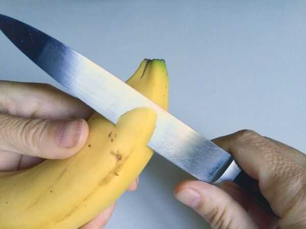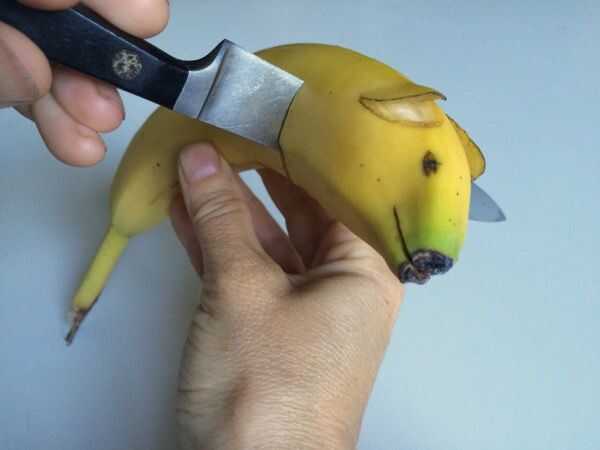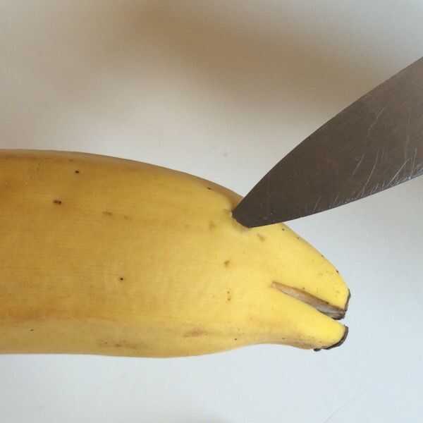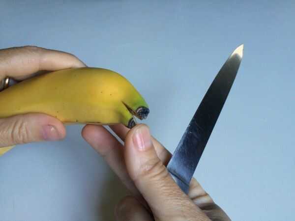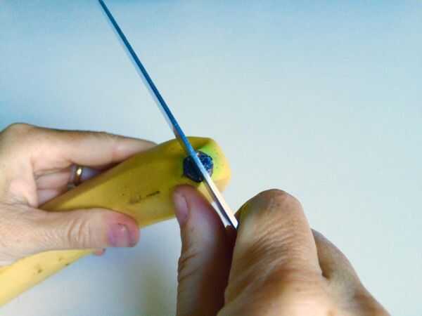 Corte el hocico haciendo una pequeña ranura en la parte inferior del plátano.