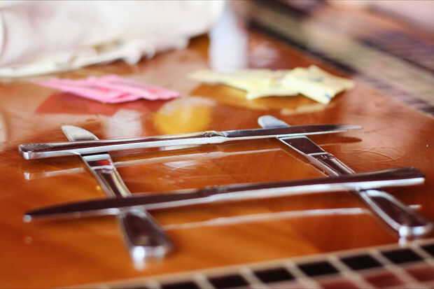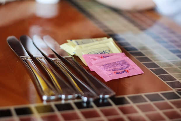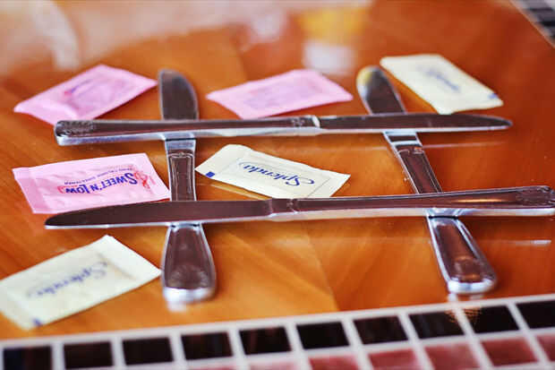 Pila de sus cuchillos en un patrón de tres en raya y usar paquetes de azúcar como marcadores! Una solución fácil para aquellos tiempos te están esperando extra larga para sus alimentos llegar.