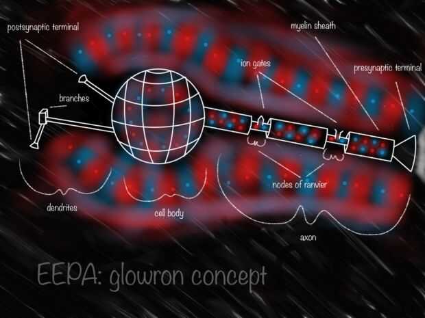En cuanto a la aplicación en la enseñanza, imagina lo siguiente (Fig. 21). Entras en una habitación oscura cuando note un suave zumbido, el glowron está en su estado de reposo. Delante de usted son varios tipos de iones (colores) como fuera de dentro de la neurona. Las diferentes partes de la neurona son claramente visibles; el cuerpo celular, las dendritas con ramas y las terminales postsinápticas, el axón con sus diferentes partes terminando en la terminal presináptica. Se le pedirá que si desea ser un ión, acepta con una sonrisa (es uno de sus más grandes sueños). Transformar al sodio usando un guante con luz roja en las puntas. Ahora, ¿qué pasará si se inyecta usted mismo fuera de la neurona, dentro de la neurona, en el cuerpo de la célula, en los nodos de ranvier, en las partes mylinated? Observa cómo cambios de concentración de iones, como puertas del ion se abren y cierran mecánicamente y oyes cómo cambia el potencial de membrana. Elegir el lugar adecuado para la inyección, desencadenan una reacción en cadena. El zumbido suave previamente se convierte en más fuerte y más alto en echada, mucho movimiento ocurre en el axón! Los iones están fluyendo abajo del axon, de repente escuche un crack, ver un flash y te das cuenta, la neurona se enriquecieron. Exitado te preguntas cómo el fuego se transmite a la neurona siguiente, pero eso es capítulo 2.