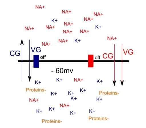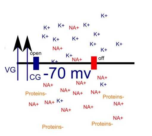 Como ya dicho, el disparo de las neuronas es una función del estado de las puertas de ion y las dos fuerzas de gradiente. Las especies de iones importantes en el modelo son sodio (NA +), potasio (K +) y cloro (Cl-). En el potencial de reposo, lo que significa que la neurona se encuentra en una especie de estado de línea de base y está lista para disparar, NA + se concentra fuera de la neurona y el potasio en el interior (Fig. 3). Las puertas de ion están casi cerradas, muy que pocos iones pasan la membrana. Tenga en cuenta también que el interior de la neurona está cargado negativamente debido a las proteínas. ¿Usted cómo el gradiente de fuerzas efecto los iones? Basta con ver en la figura 3. NA + tiende a conseguir empujado dentro de la neurona, y se concentran más los iones NA + fuera de la neurona interior está cargada negativamente. En cuanto a K +, las dos fuerzas actúan en sentido contrario. El gradiente de voltaje empuja otra vez dentro de la neurona de iones K +, pero la carga negativa empuja los iones de K + fuera de la neurona.