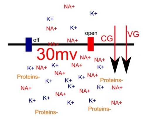 Primero echamos un vistazo a las dos fuerzas implicadas; el gradiente de la concentración y el gradiente de voltaje. Se llama gradiente debido a la fuerza particular tiende a 'empujar' el amanecer de los iones el gradiente, como una bola de papel hacia abajo de una colina. El gradiente de concentración es la fuerza que tiende a distribuir igualmente los iones a ambos lados de la membrana (Fig. 1). Así, si tenemos 30 iones de un lado y 70 iones sobre los otros (100 total iones), ion abrió puertas y no hay otras fuerzas implicadas, que el gradiente de concentración empujaría a los iones en la dirección de la solución con menos iones. Terminamos con una distribución 50: 50 de iones. El gradiente de voltaje, por el contrario, toma en cuenta la carga de iones, que puede ser positiva o negativamente cargado. Como seguramente recordarán de la escuela, frente a los cargos atraer mientras que cargas iguales derogación. Permite decir que tenemos una neurona cargada negativamente respecto al exterior y los iones que son positivamente cargada (Fig. 2). ¿Sabes qué pasa? Derecha, los iones tenderán a moverse dentro de la célula, en la dirección de la carga opuesta.