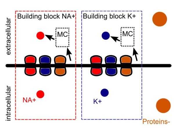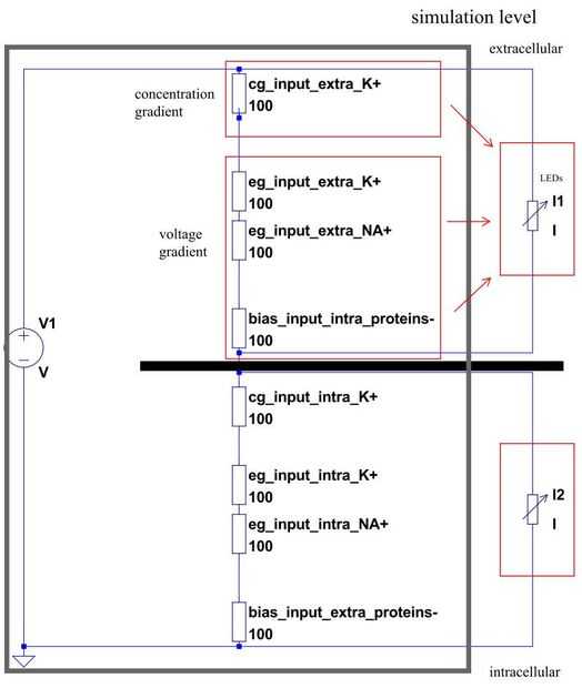 Echar un vistazo a la figura 9 para la aplicación analógica. La figura muestra un bloque de edificio independiente para la simulación de un tipo de ion. Un circuito divisor de tensión indica la salida a los LEDs dentro y fuera de la neurona. El divisor se hace de la LDRs que la entrada de la luz del otro lado de la neurona. Por ejemplo, el gradiente de la concentración de K + es el modelo por el LDR superior que recibe la entrada de K + luz interior de la neurona. Recuerde que el gradiente de concentración empuja los iones a una distribución 50: 50, por lo que si sintoniza correctamente la salida de LED conduce a la misma cantidad de luz fuera de la neurona que recibe entrada desde el interior. El gradiente de tensión se implementa de forma similar, sólo que los otros cargos deben tenerse en cuenta también. La salida a los LEDs de un tipo de ion es el resultado de las LDRs diferentes en un sitio del divisor de tensión. Debo decir que, aunque yo prefiero el método analógico, el templar fino del circuito sería un desafío.