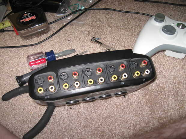 Ahora que todos los sistemas están en su lugar, pegué al conmutador de vídeo sobre el lado con los botones de alineación en el centro de los agujeros.