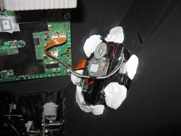 La instalación del lector de disco era el siguiente. Mi idea sobre el epoxi era un poco más difícil de previsto, porque tenía que girar constantemente mi disco para asegurarse de que el epoxi endurecido mientras el lector de disco estaba en recta. Por alguna razón, mantuvo tratando de moverse, así que tuve que presionar muy duro con una mano y periódicamente girar el disco con el otro. Después de aproximadamente media hora, quitó mis manos y encendió el disco unas cuantas veces para asegurarse de que le de la vuelta. Por suerte no se perdió mi media hora. Gira muy bien!