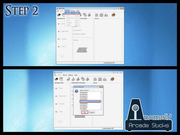 Paso 2. Haga clic en "Dispositivo - seleccione". Seleccione "ATmega32U4" y haga clic en "Aceptar". (Muchas de las selecciones disponibles se ven muy cerca del mismo nombre, así que comprobar usted seleccionar el correcto).