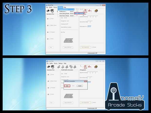Paso 3. Haga clic en "configuración - comunicación - USB". En la nueva ventana haga clic en "Abrir". (Si no el equipo para reconocer el palo entonces esto no funcionará. Si has seguido la guía para su sistema operativo y todavía no está funcionando, entonces desenchufe y enchufe el palo nuevo mientras sostiene "Start" en el palo. Si no funciona entonces probar una entrada USB diferente del ordenador.)
