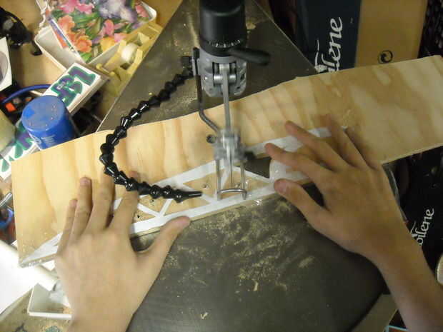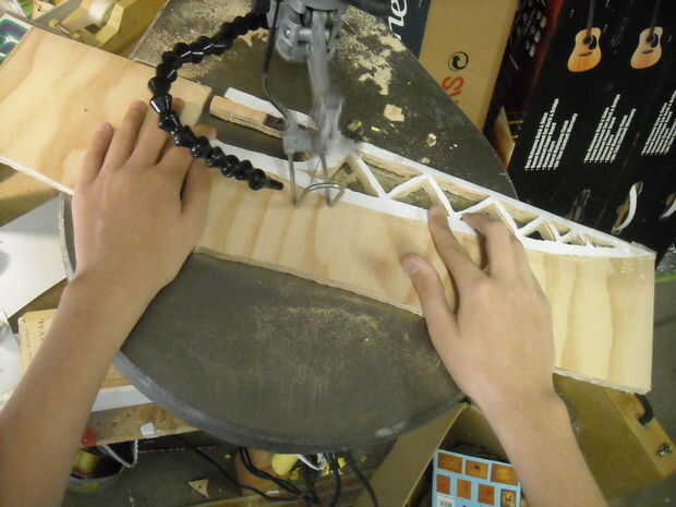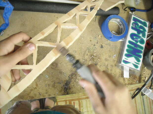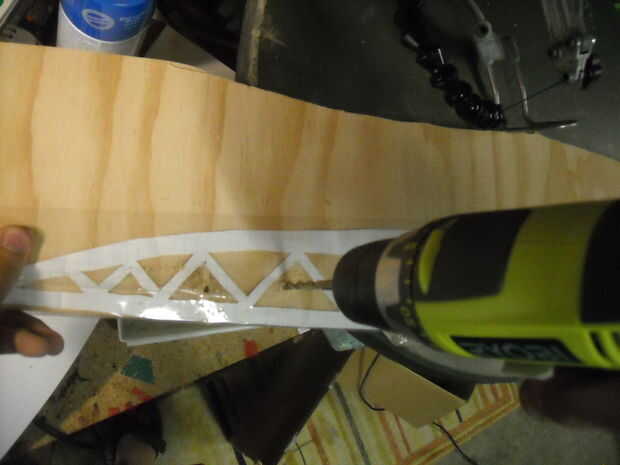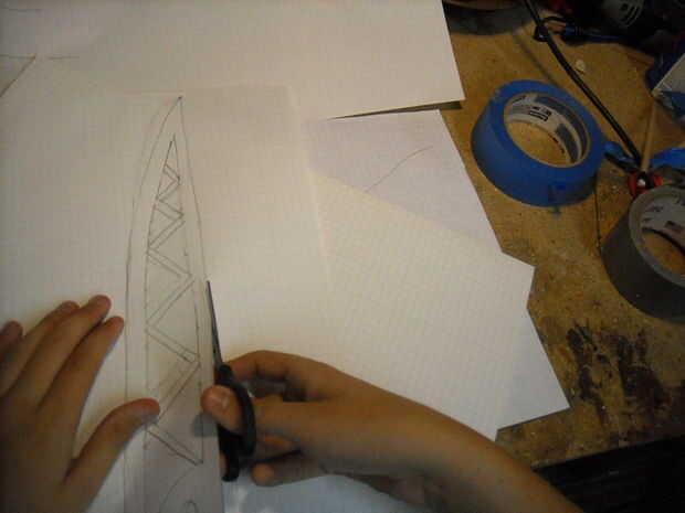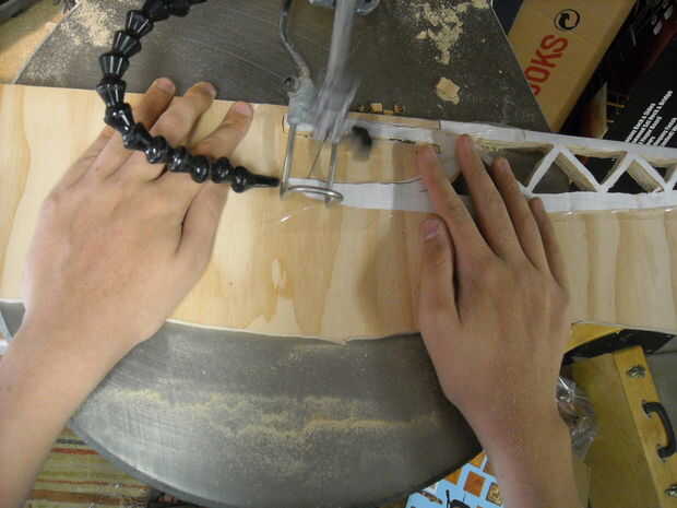Si usted sacó la espada papel cortado y o trazar el contorno, o uso cinta adhesiva transparente para sujetar la plantilla a su madera. Si usted dibujó directamente sobre la madera es clara para empezar a cortar. No te apresures los cortes! es fácil de cortar a gran parte de la hoja, pero no te preocupes si el borde es un poco desigual. Como es la forma general de la hoja de la espuma cubrirá hasta cualquier baches por lo que la espada le resultan bellas. Para terminar la hoja de lijar los bordes con la herramienta rotatoria de preferencia. Si el borde no es liso puede dañar el interior de la espuma.