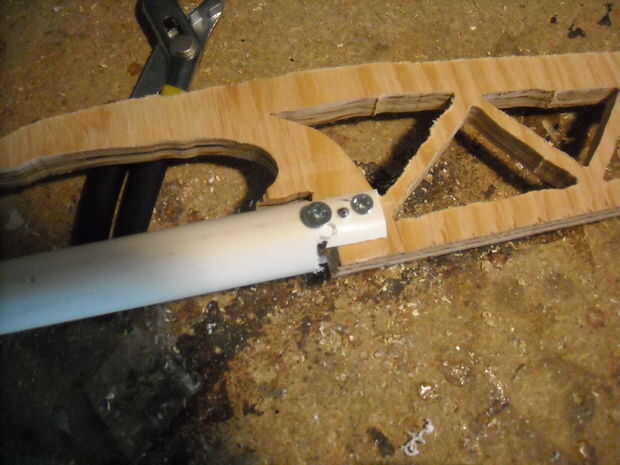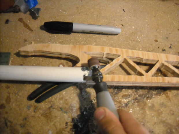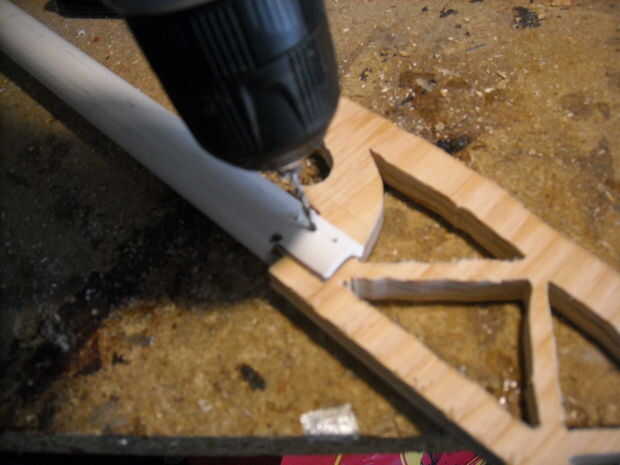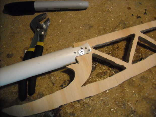 Tomar la hoja y la arena abajo el soporte para que quepa en el tubo. Inserte la hoja en el mango y si la ranura se corta la hoja debería caber estrechamente y se realizará entre los dos lados del PVC. Consigue un taladro de broca un poco más pequeño que el tamaño de la base de sus tornillos y perfore agujeros en las marcas completamente pensado el sándwich de tubo de lámina. Ahora Atornille la Asamblea. Utilizando la herramienta giratoria, cortar el tornillo sobrante o moler abajo de la punta.