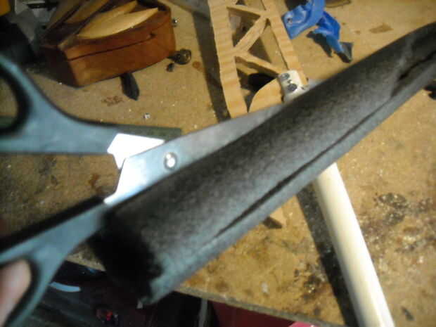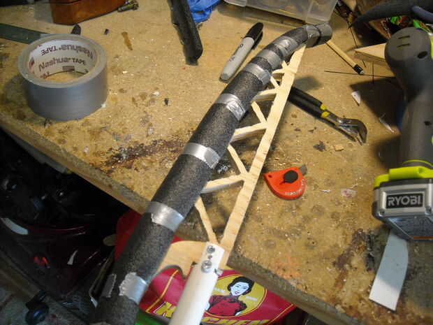Para hacer la espada seguro utiliza aislamiento de la pipa en el borde de la hoja. Aislamiento de la pipa de tamaño completo es un poco demasiado grande por lo que recomiendo cortar la espuma a 3/4 de su tamaño normal. Tome el aislamiento de la pipa y colóquelo sobre el borde de la hoja. Si hay cualquier esquinas agudas en su hoja de cortan el aislamiento de la pipa en ángulo para que encaje en. Uso de finas tiras de pato cinta Coloque la espuma a la madera. Con más cinta tapa la hoja entera. La espada está ahora completa.