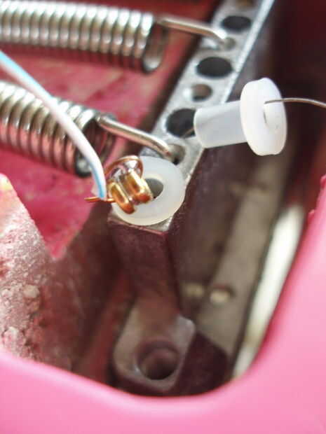 Para comenzar con, saque la tapa de plástico en la parte posterior de la guitarra que esconde la procedencia a través de las cuerdas. Luego quitárselo completamente las cuerdas de la guitarra. En la parte posterior de la guitarra, verás donde descansan las bolas en las cuerdas. Nos va poniendo los insertos de plástico amplia en esos agujeros para que la parte de la bolita de la cadena de no tocar el metal.