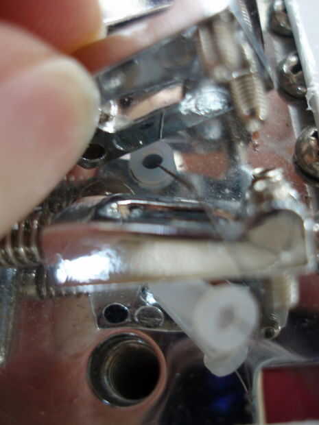 Con cada cuerda, hilo de rosca uno de los insertos delgados y largo abajo de cada cuerda para que la parte de la brida está más lejos de la guitarra. Este primer conjunto de inserciones irá en el orificio directamente en la cara de la guitarra. Ayuda a girar la silla de montar 90 grados para que puedas acceder más fácil debajo de ellos. Podría tomar un poco de risa floja alrededor, ya que la placa frontal en el puente podría no ser perfectamente alineada con los agujeros de las cadenas vienen a través de, pero consigue la primera serie de los insertos al ras con la placa frontal del puente.
