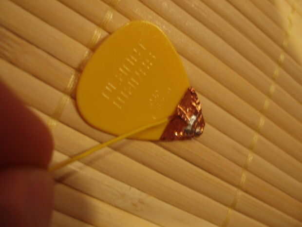 El último paso real es hacer una selección de conductor. Tira de un poco del alambre largo encabezado con el conector de selección. Corte una tira delgada de cinta de cobre y se usa para la broca pelada del alambre a la parte inferior de la hoja de la cinta. Si usted quiere asegurarse de que la conexión es buena, o si su cinta no tiene conductor adhesivo, poner un poco de soldadura entre la parte superior de la cinta y el alambre. Luego Envuelva la parte inferior de la hoja con cinta de cobre.