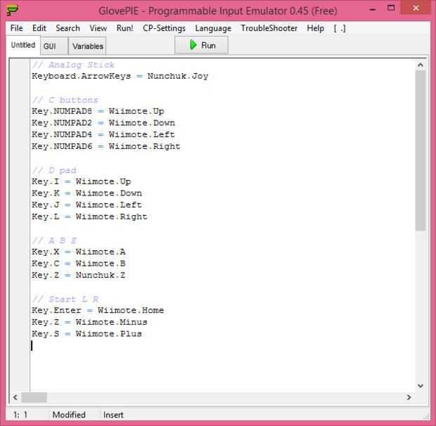 Ahora abrir GlovePIE y en la ventana principal, introduzca la siguiente secuencia de comandos: