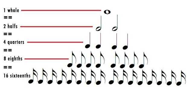 Redonda = 2 notas medio = 4 notas de cuarto = 8 corcheas = 16 semicorcheas = 32 treinta – segunda nota = etc....