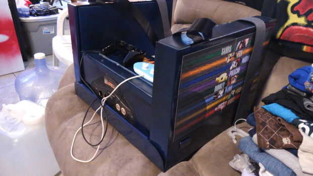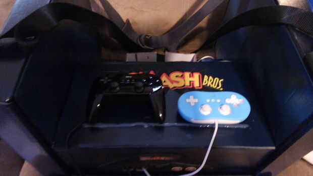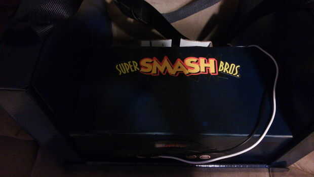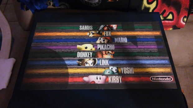 Para agregar interés visual, imprimir el logo de Smash Bros y el cuadro de carácter limpio. Ampliado la imagen del personaje para encajar un poco mejor para que tengas que imprimir ambas mitades y asegúrelas con cinta adhesiva. Pegarlos en.