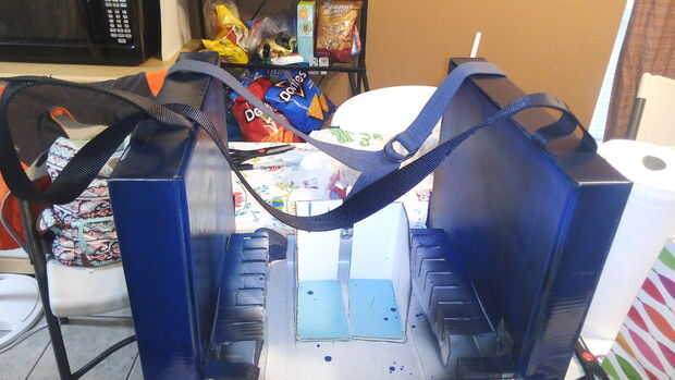 Para la correa trasera, acabo de poner los 2 cinturones para hacer una larga y deslizarse bajo el extremo de la caja en la parte posterior. Luego coloque la cinta sobre su cabeza. No tienes que garantizar esta correa porque su cuerpo lo mantiene en su lugar.