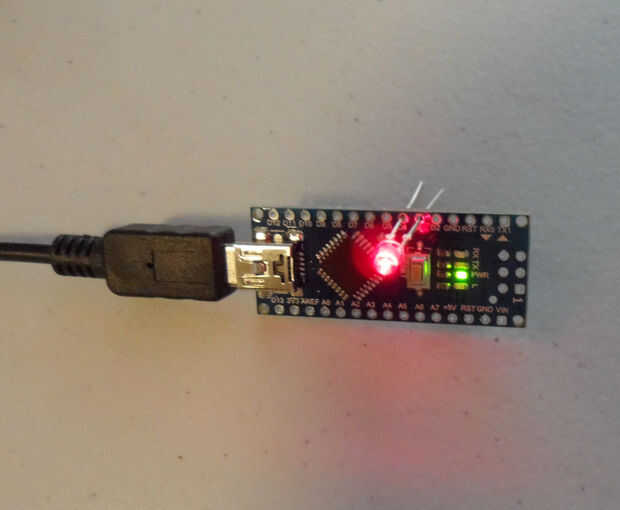 Conectar un LED en lugar de un altavoz como el anterior es muy interesante. No hay ninguna necesidad de preocuparse por la tensión, los niveles actuales, resistentes a o polaridad incluso para el caso (caso peor no ligero, entonces sólo vuelta). Probar, en primer lugar, con el cable de negativo (cátodo) conectado a tierra y el otro a D3 o D4. El LED será la 'mitad' encendido, debido a las ondas cuadradas. No objetor se requiere adicional como la salida de la MicroControllerUnits limitada actual. Hice las mediciones de corriente dando por resultado 15ma y 20ma para los Attiny85 y el MCU Atmega328 respectivamente. Estos niveles son aproximadamente la mitad el valor limitado para estas piezas debido a la naturaleza del ciclo de deber del 50% de las señales de onda cuadrada de conducción. Las lecturas del medidor son realmente un promedio de la corriente a través de la prueba del circuito.