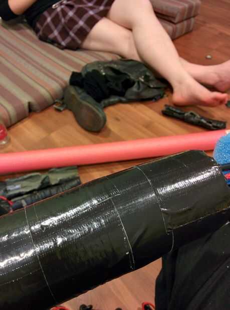 Cortar los tallarines de la piscina en pedazos. Secciones más largas de relleno ayudará a impedir que la cadena consigue envuelto alrededor de un personal. Pero asegúrese de poner una pequeña sección entre las más grandes para asegurarse de que todavía puede hacer pivotar suavemente.