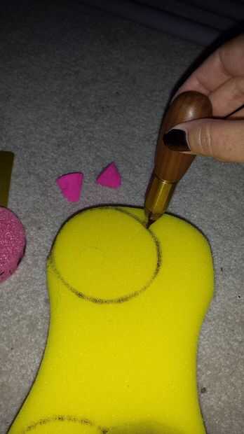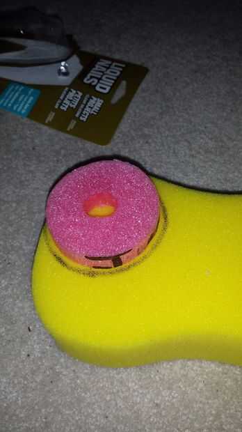 4. Cortar un cilindro de espuma de lavado con una pieza de los tallarines de la piscina para una plantilla. Mi esponja fue unos 5-6cm de espesor, lo que para un bonito cojín para el final de su pompfen.