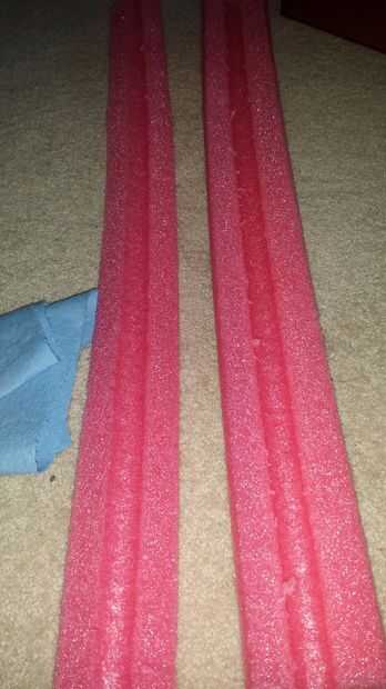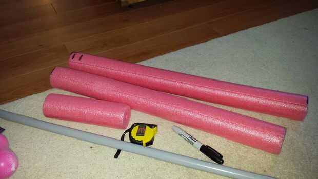 2. Con una caja de fresa o algo similar, corte su fideos piscina en tramos de 60cm. También tuve que mina partida en dos en vez de justo por la mitad porque era demasiado pequeño para el tubo de slide en el orificio central.