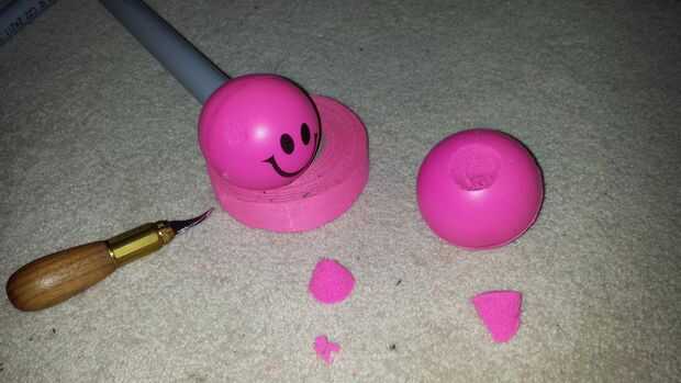 3. Utilizando el extremo de un tubo, marcar un círculo encima de las bolas de estrés y tallar hacia fuera un agujero. Desea que los tubos para caber en su interior hasta que hay solamente alrededor de un centímetro de la espuma que cubre el extremo.