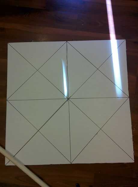 una vez que tengas plazas, puede utilizar una cadena y un marcador para hacer un círculo, una vez que tengas el centro exacto de la Plaza. Para encontrar el centro exacto, dibujar un patrón como lo he hecho en la foto de arriba. Hacer una cruz de esquina a esquina y entonces desde el punto medio de cada lado, trazar una línea recta hacia el lado opuesto. Técnicamente uno de ellos solo va a hacer pero haciendo ambos aumentará su precisión y también se puede ver si su plaza es una plaza.