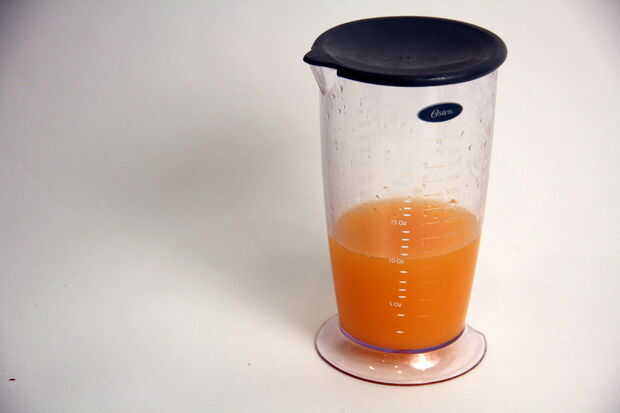 Jugo de 17 onzas de jugo de naranja y repitiendo el método de congelación/descongelación descrito anteriormente dos veces, condensada a cerca de 10 oz. Es mucho sabor más fuerte y más grueso en consistencia. También se puede ver un oscurecimiento del color (las fotos están en orden).