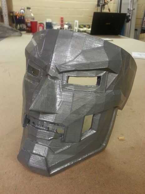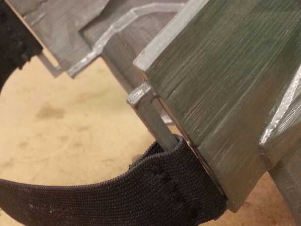 Encima de una máscara de Dr. Doom para un local con comic, probé unos métodos diferentes para colocar las correas que con poco éxito. Debido al peso de la máscara sólo casi todo lo que tiró de él. Así que imprimí pequeñas muescas y usa la mezcla para péguelas al lado de la máscara, como se muestra. Luego funcionó un elástico a través de él y cosidos juntos. Funcionó muy bien! Me hizo un montón de elogios también.