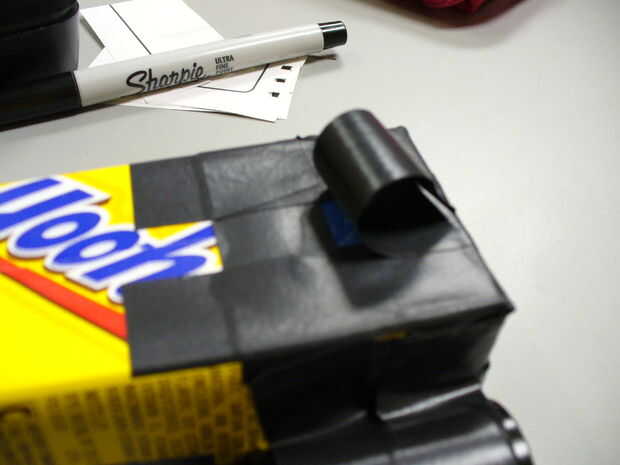 La luz pasa a través del agujero de alfiler y expone la película. Así que para evitar que el agujero de alfiler constantemente inundando la película con la luz, tenemos un disparador. La forma más sencilla de hacerlo es otro pedazo de cinta aislante handy dandy. Golpear un trozo de la cinta sobre el agujero y abra para exponer la película.