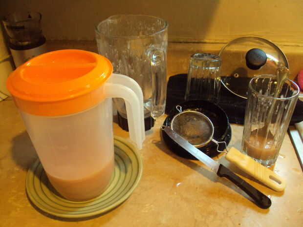 Después de licuar, poner el colador en una jarra de jugo y verter lentamente sobre una taza a la vez de jugo a través de él (en este caso tenía en mano un filtro más pequeño y tuvo que verter aproximadamente 1/4 taza a la vez).