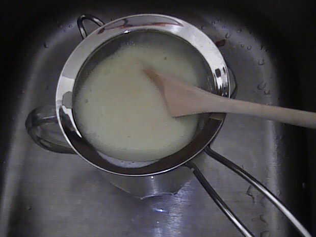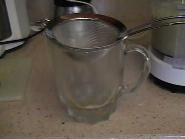 Configurar el colador sobre el recipiente y vierta la mezcla mezclada. La mezcla tiende a obstruir el colador muy rápidamente. Con el fin de ayudar a través de la coladera, revolver con una cuchara de madera. Casi todo pasa por excepto las semillas y un poco de la pulpa.