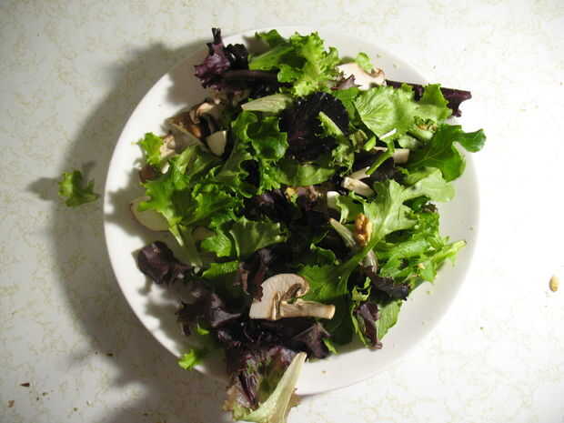 Encontrar una placa. Poner la mezcla de lechuga en él. Mano mezclar los frutos secos y setas en él.