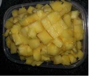 7. cortar la piña en trozos pequeños y colocar en un recipiente lo suficientemente grande para introducir las rodajas de piña, rebanada de mango y jengibre rodajas (ver ADVERTENCIA) (representados arriba).