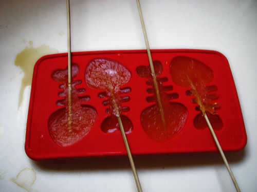 Después de 15 minutos, sacar el molde del congelador y colocar los palillos en los hielos. Añadimos unos jugo otra vez para el desgaste el lugar perforado. Luego coloque el molde en el congelador otra vez y esperar 2 horas.