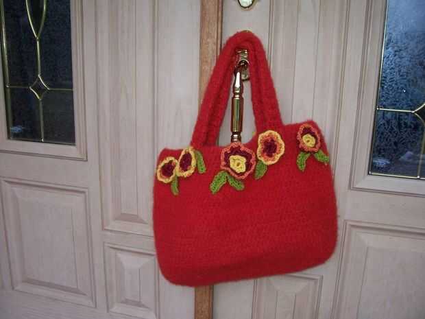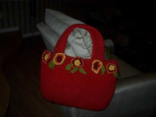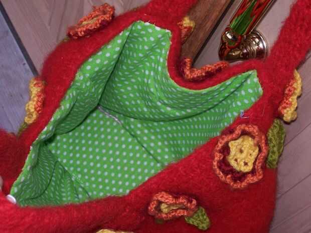 Para acabar, de ganchillo, pero no sentía las flores de alrededor del borde. Ésos fueron cosidas en antes de que la guarnición fue agregada. Puede sonar como mucho trabajo, pero que muy fácil y se fueron rápidamente por el gancho de tamaño más grande. Usé algunos lana Lopi que ya tenía, y partes y piezas de sobras para las flores. Cualquier patrón de bolso básica funcionará. Definitivamente se pone atención!