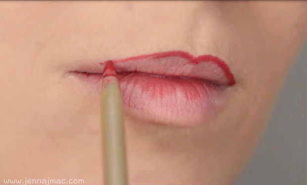 Primero comenzar delineando tus labios y luego aplicar el lápiz labial rojo.