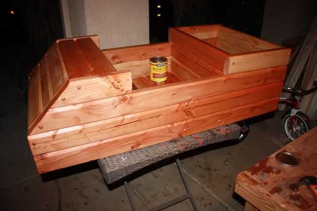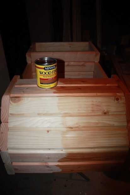 me gusta la mancha de cereza de minwax, da una mancha medio bonita el 2 x 4. Mancha el parabrisas separado debido a que la pintura tiende a sangrar un poco. Asegúrese de que le das los extremos de la 2 x 4 un poco mancha extra, realmente empaparse de lo. Luego viene la frotación en el poli, va verdaderamente fácil y proporciona cierta protección y permite la limpieza fácil.