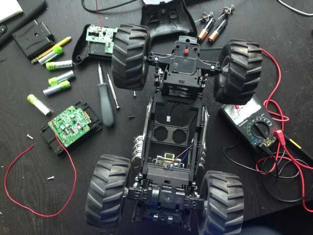 En mi caso, tengo el monster truck de mi vecino después de que su niño de 6 años de edad rompió el receptor y si el carro también fue en un mal estado. Después de varias veces tratando de arreglar el controlador, deciden tira el camión como se muestra en la foto de arriba y comprobar si los motores y el soporte de la batería eran todavía funcionales.