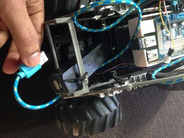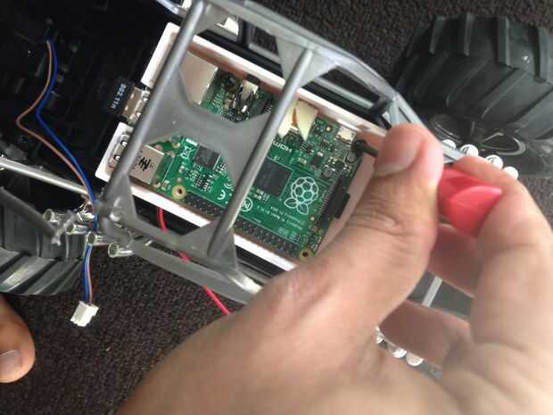 Ahora con un destornillador y los tornillos que rescató del carro montar la base sobre el soporte de la batería de montaje diez el Raspberry Pi en la base y el camión