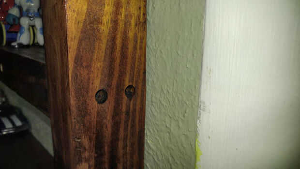 Usé una plantilla de agujero de bolsillo para conectar el riel superior e inferior del estante. 3 media se instalaron con pegamento y tornillos desde el exterior.