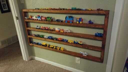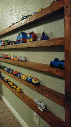 Cuando estaba montado y listo, me ayudó a colocar los coches en los estantes. Después corrió les hacia adelante y hacia atrás como si fuera un camino de...