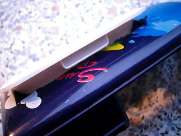 Ahora tienes que hacer algún lugar en los bordes del agujero donde encaja esta cajita gris en el adaptador. Cortar todo hasta que el adaptador encaja perfectamente en el agujero!