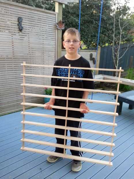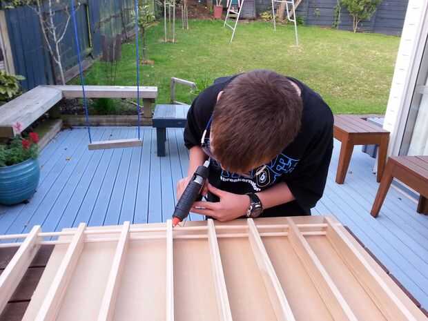 Se utilizó una pistola de pegamento caliente y pone una gota en la parte posterior de cada pasador en la parte inferior de la plataforma. Los exteriores se hicieron primero y luego el último medio, teniendo cuidado de asegurarse de que las estanterías alineadas con las marcas de los tacos. Probablemente podría utilizar algunos menos fea cola, o un pasador muy fino panel había clavado aunque la parte trasera del estante y en el taco posterior. Si tienes una pistola de grapas con grapas largas incluso un alimento básico.