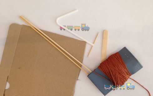 Materiales• 2 pedazos de cartón rígido (aproximadamente 6 x 6 cm)• una perforadora o tijeras• cinta de• 1 banda elástica (unos 8 cm de largo)• 1 palillo fuerte (o palo de fósforo o helado)Paso 1.Hacer agujeros cuadrados de cartulina intwo con una per
