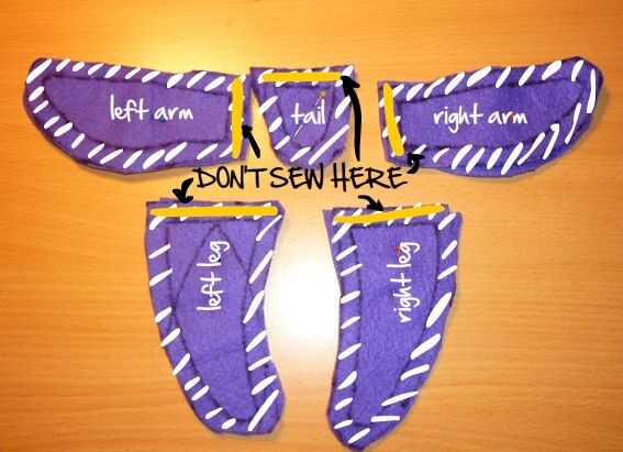 Deje las partes que se marcan en amarillo abierto así podrás vuelva la brazos/piernas/cola y llenarlos.