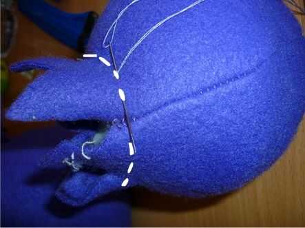1) coser libremente alrededor de la parte inferior de la cabeza, luego tire suavemente del hilo hasta que se forme un pequeño cuello.