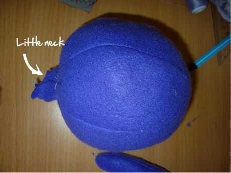3) utilizando un inicio de puntada escondida coser la cabeza sobre el cuerpo. Cuando estés casi todo el camino alrededor, agregar algún relleno de juguete para hacer la forma que desee a la cabeza. Si quieres la cabeza para colgar, colocar un poco más relleno ta la espalda, si quieres recta, coloque alrededor igualmente. Cuando esté satisfecho con el resultado, coser el cierre el agujero restante.
